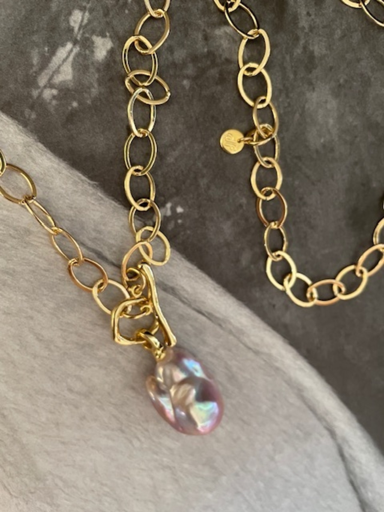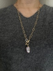 存在感抜群の大ぶりなバロック淡水パールを使用したネックレスです。うっすら紫がかった薄ピンクの優しい色合いで、光のあたる角度によってピンクやパープル、グレーにも見えたりします。